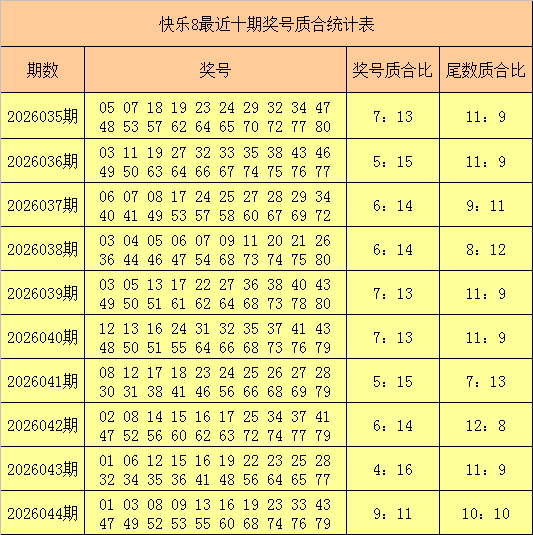 福彩平静8第2026044期开出奖号:01 03 08 09 13 16 19 23 33 43 47 49 52 53 55 60 68 74 76 79,其中奖号质合比为9:11,奖号余数质合比为10:10。