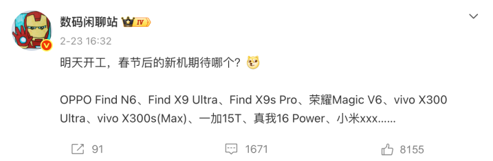 这么来看,折叠屏有荣耀Magic V6和OPPO Find N6,旗舰机有OPPO Find X9Ultra和vivo X300Ultra。小屏有OPPO Find X9sPro和一加15T,而大屏则是vivoX300Max和小米17Max,分得还挺细。