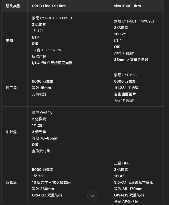 而vivo X300 Ultra是2 亿像素 35mm 东谈主文主摄(1/1.12"索尼 LYT-901,蔡司 T * 镀膜,OIS)、5000 万像素大底超广角(1/1.28")、2 亿像素三星 HPB 3.5–7.1 倍调治光学潜望长焦(蔡司 APO 认证,OIS);500万级多光谱传感器+全链路颜色科学。