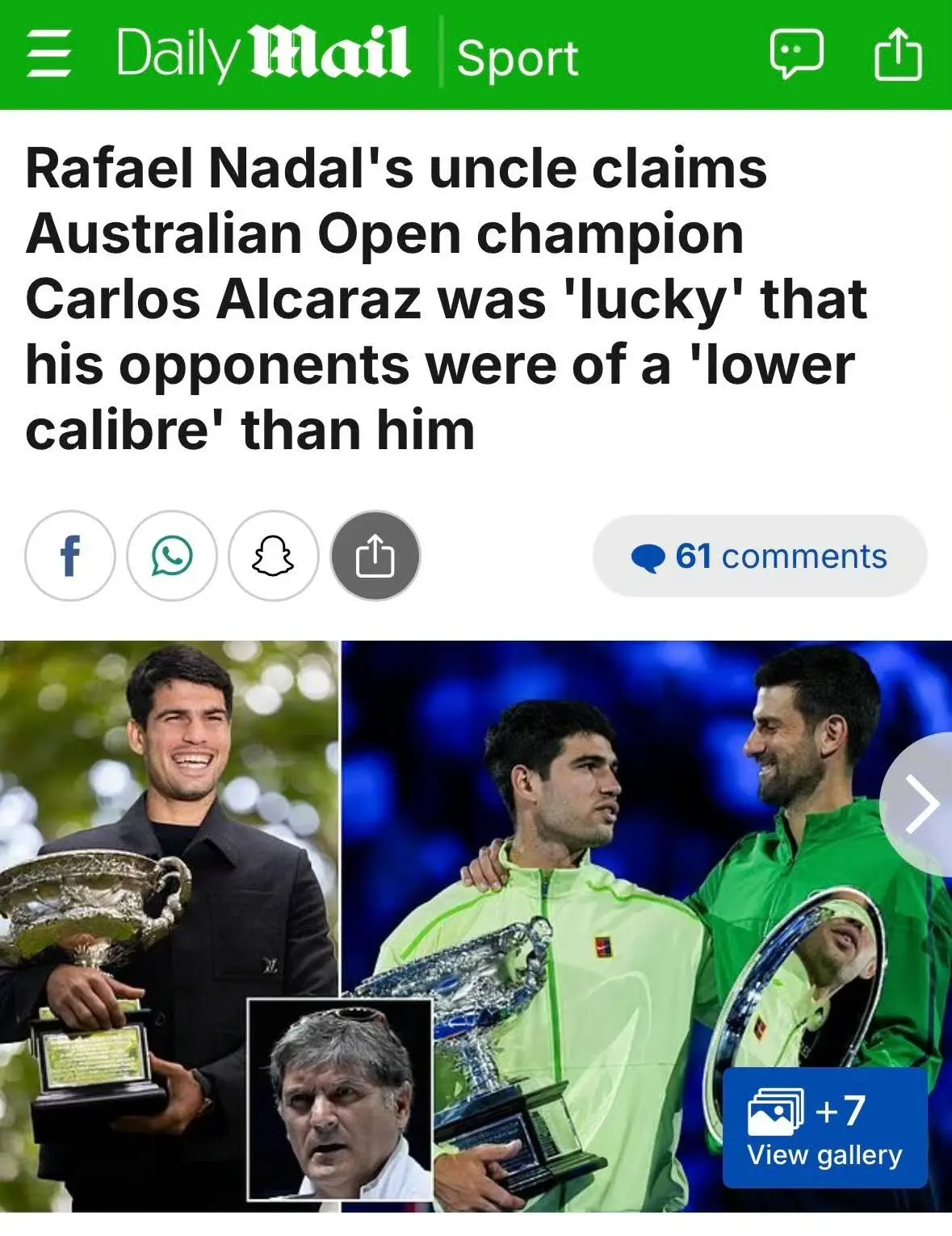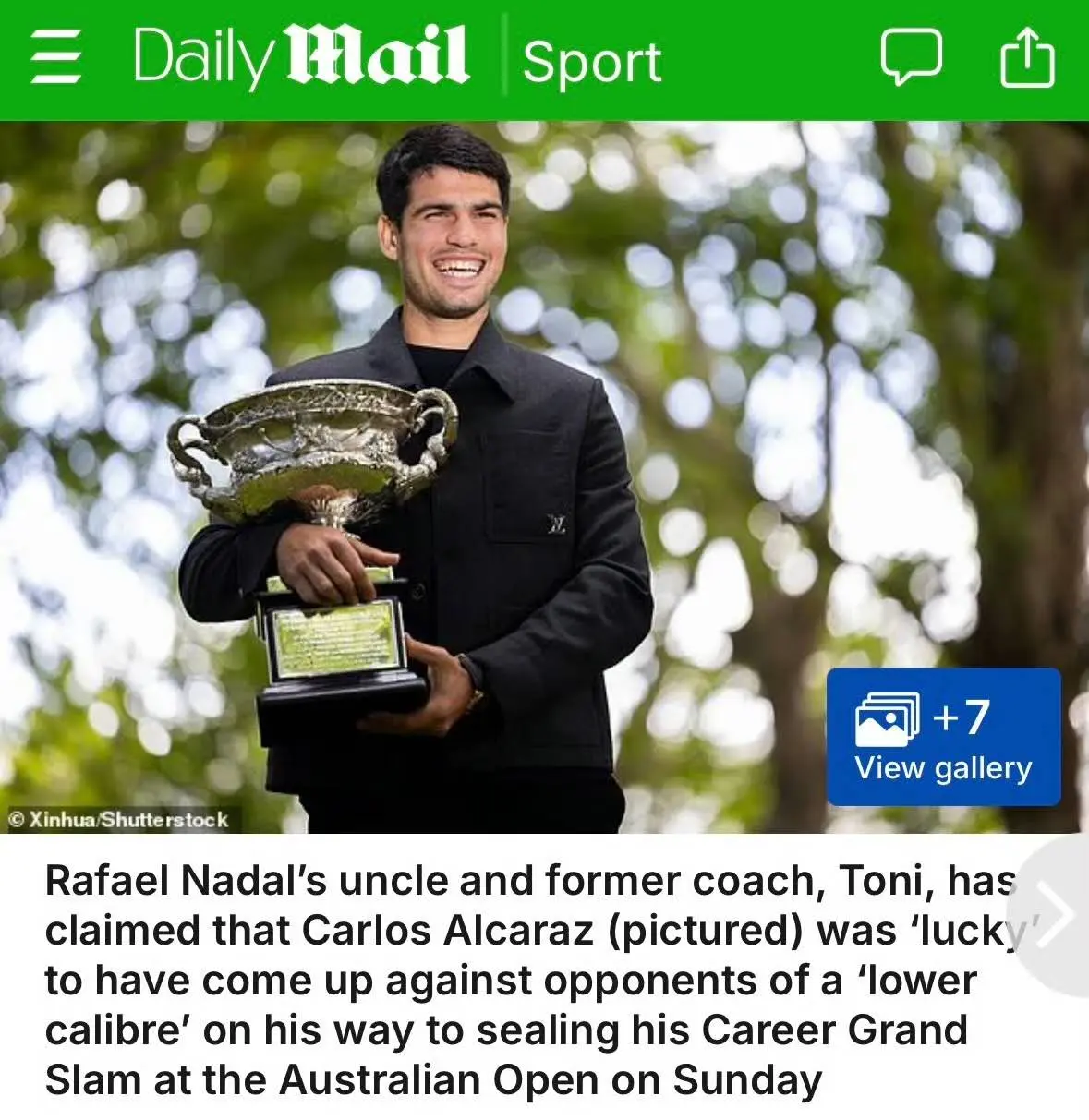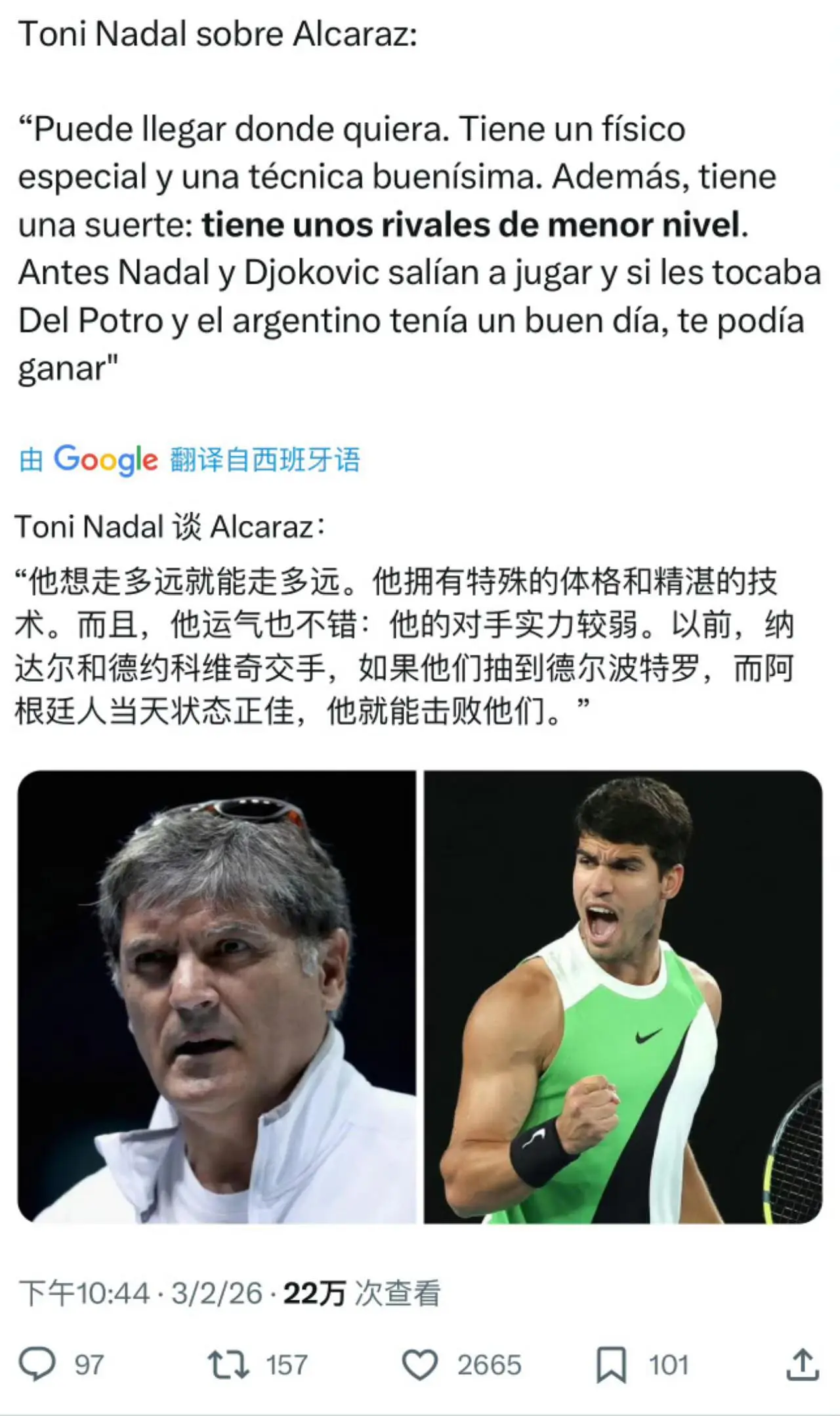 这位培养出一代天王的功勋见地,在笃定阿尔卡拉斯领有“出色的躯壳条款”和“罕见的技能”后,话锋一溜,对这位新科澳网冠军的夺冠之路给出了令东谈主有时的评价:在他看来,阿尔卡拉斯之是以能夺冠很大一部分归功于他的运谈可以,托尼叔叔示意,“他的敌手合座水平齐不如他,况兼决赛很行运碰见比他水平低许多的选手。”