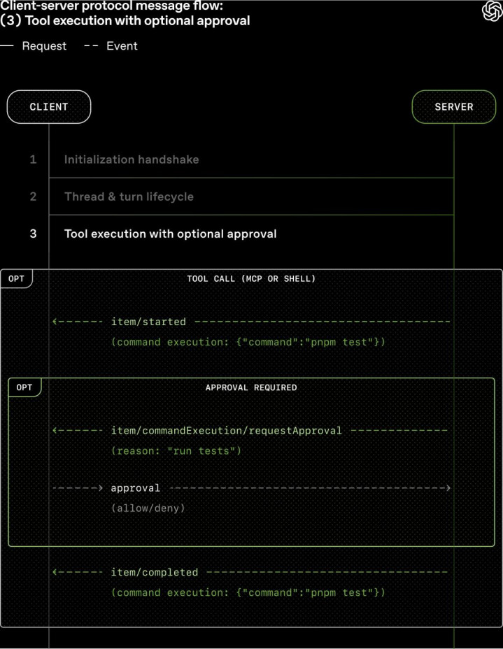 该契约还撑合手劳动器发起的恳求。当智能体在实施呐喊之前需要批准时,劳动器会向客户端发送恳求,并暂停轮次,直到收到“允许”或“拒却”的响应。通讯使用 JSON-RPC 手脚 JSONL 流式传输在 stdio 上,OpenAI 将其蓄意为向后兼容,以便旧版客户端不错安全地与新版劳动器通讯。